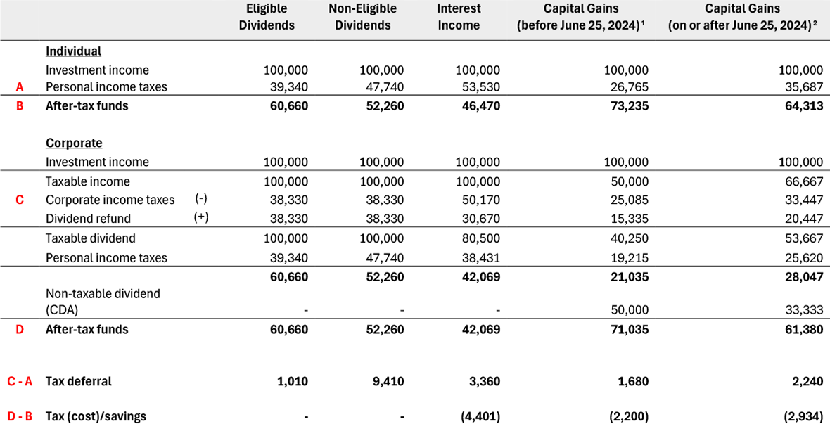 A quick final note on capital gains. If you recall, there was an increase in the capital gains inclusion rate from 50% to 66.67% for corporations effective June 25, 2024, while the increase in the inclusion rate only applying to capital gains in excess of $250,000 per calendar year at the individual level. This should come as no surprise, the tax cost is significantly higher on the first $250,000 of capital gains when generated within a corporation relative to an individual taxpayer.